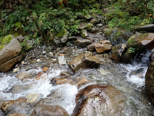 下の写真が最後の渡渉点。急な岩が露出したところです。ここまでも単純な徒渉だけではなく、短い高巻きやへつり(水流のすぐ横の岸壁をへばりつくようにして横に進むこと。)